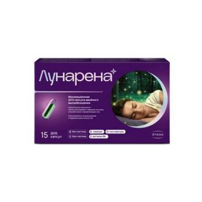 Компоненты, входящие в состав ЛУНАРЕНА: масло лавандовое, экстракт пассифлоры, витамин B6 могут способствовать уменьшению чувства тревоги, стресса, улучшению продолжительности и качества сна. ЭФИРНОЕ МАСЛО ЛАВАНДЫ (Lavandula Angustifolia Mill, 80 мг): помогает снижать уровень тревожности и стресса, смягчает возбудимость и раздражительность, помогает организму справляться с физическими и эмоциональными перегрузками, способствует снижению напряжения и усталости после трудного рабочего дня, уменьшению тревожности. ЭКСТРАКТ ПАССИФЛОРЫ ИНКАРНАТНОЙ (Passiflora incarnata, 200 мг): оказывая мягкое успокаивающее действие на нервную систему и воздействуя на цикл сон-бодрствование (показано в экспериментальных исследованиях), может позитивно влиять на качество и продолжительность сна, что поможет вам спать крепче и проснуться отдохнувшими и полными сил. ВИТАМИН B6: Поддерживает нормальное функционирование нервной системы, а также участвует в иммунных реакциях организма. Кроме того, имеются данные, что прием витамин B6 перед сном может сделать сновидения более запоминающимися.