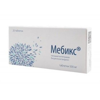 Механизм действия: Темгиколурил, действующее вещество лекарственного препарата Мебикс®, является анксиолитическим средством. Темгиколурил является близким по химической структуре к естественным метаболитам организма – его молекула состоит из двух метилированных фрагментов мочевины, входящих в состав бициклической структуры. Легко растворим в воде и во многих органических растворителях. Темгиколурил не взаимодействует с кислотами, щелочами, окислителями и восстановителями, различными лекарственными средствами и компонентами пищи. Кроме анксиолитического действия темгиколурил имеет также и ноотропные свойства. Темгиколурил действует на активность структур, входящих в лимбико-ретикулярный комплекс, частично на эмоциогенные зоны гипоталамуса, а также оказывает воздействие на все 4 основные нейромедиаторные системы – ГАМК (гамма-аминомасляной кислоты), холин-, серотонин- и адренергическую, способствуя их сбалансированности и интеграции, но не оказывает периферического адренонегативного действия. Фармакодинамическое действие: Темгиколурил обладает умеренной анксиолитической активностью, устраняет или ослабляет беспокойство, тревогу, страх, внутреннее эмоциональное напряжение и раздражительность. Анксиолитический эффект лекарственного средства не сопровождается миорелаксацией и нарушением координации движений. Лекарственное средство не снижает умственную и двигательную активность, поэтому темгиколурил можно применять в течение рабочего дня или учебы. Снотворным эффектом темгиколурил не обладает, но усиливает действие снотворных средств и улучшает течение сна при его нарушениях. Темгиколурил имеет анксиолитические и ноотропные свойства; снижает нежелательные побочные реакции, вызываемые нейролептиками и транквилизаторами группы бензодиазепинов (эмоциональная подавленность, чрезмерный успокаивающий эффект, мышечная слабость), оказывает противоалкогольное действие. У больных алкоголизмом снижен уровень эндогенного этилового спирта в плазме крови, это является одной из причин усиленного влечения к алкоголю. Темгиколурил повышает уровень эндогенного алкоголя больше, чем другие транквилизаторы, снижая влечение к алкоголю. Темгиколурил облегчает или снимает никотиновую абстиненцию. Темгиколурил не создает приподнятого настроения, ощущения эйфории, не наблюдаются привыкание и зависимость, синдром отмены. Клиническая эффективность и безопасность: В клинических исследованиях установлено, что темгиколурил повышает логичность, ассоциативное мышление, улучшает внимание и умственную работоспособность, не стимулируя симптоматику продуктивных психопатологических расстройств – бред, патологическую эмоциональную активность.