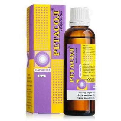 Не рекомендуется наносить раствор Ретасола® на кожу вокруг глаз, а также при выраженном остром воспалении. Нельзя наносить на слизистые оболочки. В период лечения рекомендуется использовать увлажняющую мазь и крем для тела, бальзам для губ для уменьшения сухости кожи. Следует избегать проведения глубокой химической дермоабразии и лечения лазером, у больных получающих препараты с изотретиноином, из-за возможности усиления рубцевания в атипичных местах и возникновения гипер- и гипопигментации. В ходе лечения, а также в течение 6 месяцев после него, нельзя проводить эпиляцию с помощью аппликаций из-за риска отслойки эпидермиса, развития рубцов и дерматита. Во время лечения следует ограничить воздействие солнечной инсоляции и УФ-терапии. Не рекомендуется посещение солярия. При необходимости следует пользоваться солнцезащитным кремом с высоким защитным фактором. Влияние на способность управлять транспортными средствами, механизмами: В период лечения необходимо соблюдать осторожность при вождении автотранспорта и занятии другими потенциально опасными видами деятельности, требующими повышенной концентрации внимания и быстроты психомоторных реакций.