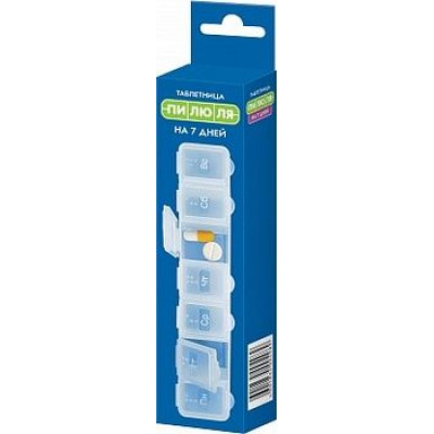 Содержит 7 отделений, которые соответствуют дням недели. Для людей с ослабленным зрением нанесены символы Брайля. Размер таблетницы без упаковки (Д:Ш:Г): 150х32х25 мм. Количество отделений: 7