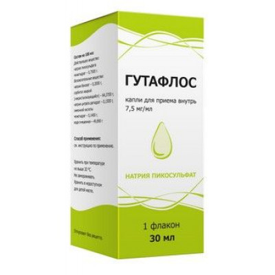 Симптомы: При приеме высоких доз возможны: диарея, обезвоживание, снижение артериального давления, нарушение водно-электролитного баланса, гипокалиемия, судороги. Кроме того, имеются сообщения о случаях ишемии мускулатуры толстого кишечника, связанных с приемом доз Гутафлос, значительно превышающих рекомендованные для обычного лечения запора. Натрия пикосульфат как и другие слабительные, при хронической передозировке может привести к хронической диарее, болях в области живота, гипокалиемии, вторичному гиперальдостеронизму, мочекаменной болезни. В связи с хроническим злоупотреблением слабительными может развиться повреждение почечных канальцев, метаболический алкалоз и мышечная слабость, связанная с гипокалиемией. Лечение: Для уменьшения абсорбции препарата после приема внутрь можно вызвать рвоту или провести промывание желудка. Может потребоваться восполнение жидкости и коррекция баланса электролитов, а также назначение спазмолитических средств.