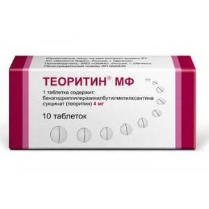 Действующее вещество: Бензгидрилпиперазинилбутилметилксантина сукцинат (теоритин) в пересчете на 100 % вещество 4 мг. Вспомогательные вещества: Целлюлоза микрокристаллическая 149,6 мг, Карбоксиметилкрахмал натрия 4,8 мг, Кальция стеарат 1,6 мг.