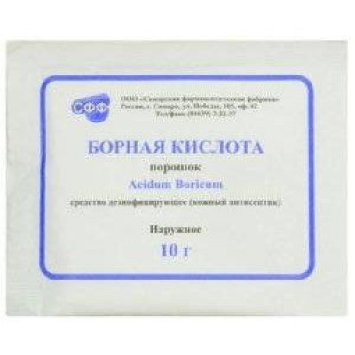 Борная кислота - антисептическое средство, оказывает также инсектицидное (в т. ч. противопедикулезное) действие. Коагулирует белки (в т. ч. ферментные) микробной клетки, нарушает проницаемость клеточной оболочки. 5% водный раствор подавляет процессы фагоцитоза, 2 4% раствор задерживает рост и развитие бактерий. Обладает раздражающим действием на слизистые оболочки, грануляционные ткани. Всасываясь, оказывает системные токсичные эффекты.