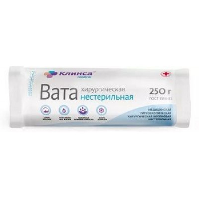 Медицинская гигроскопическая хирургическая хлопковая нестерильная вата. Применяется в медицинских, санитарно-гигиенических, косметических целях. Высокая впитывающая способность. Вата изготовлена без использования хлора.