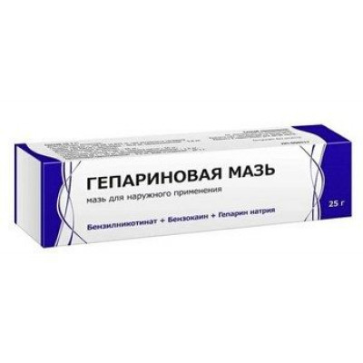 Состав на 1 г: Действующие вещества : гепарин натрия - 100 МЕ (0,833 м г при активности гепарина натрия 120 МЕ/мг), бензокаин - 40,0 мг, бензилникотинат - 0,8 мг. Bcпoмогатeльныe вещества : глицерол - 150 мг, вазелин - 60 мг, стеариновая кислота - 50 мг, персика масло - 50 м г, эмульгатор №1 - 50 мг, метилпарагидроксибензоат - 1,5 мг, пропилпарагидроксибензоат - 0,5 мг, вода очищенная - до 1 г.
